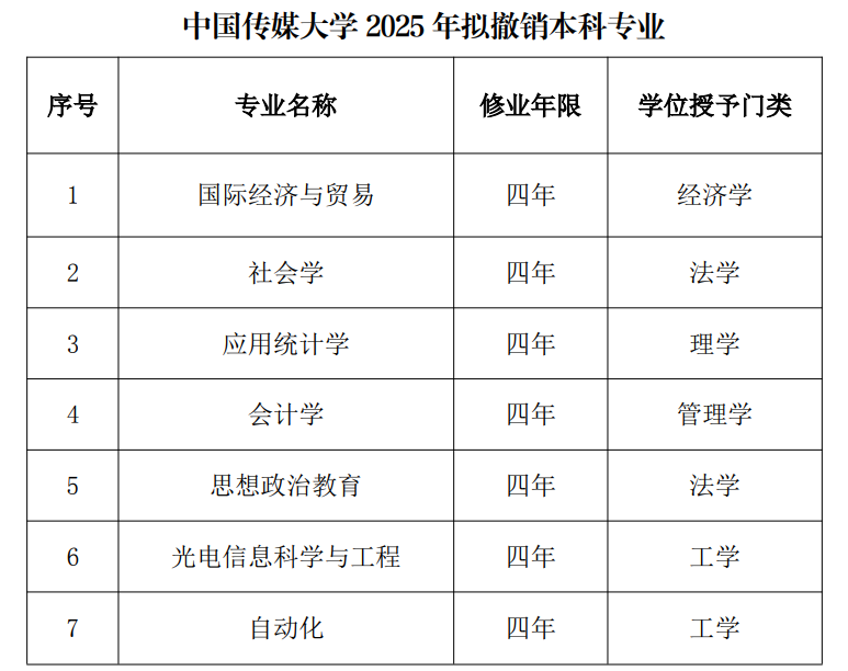 IT之家查询中国传媒大学官网公告发现,该校 2025 年拟撤销本科专业包括国际经济与贸易、社会学等 7 个专业。结合发言来看,预计该校 2026 年招生将一口气砍掉最新披露的 16 个本科专业和方向。